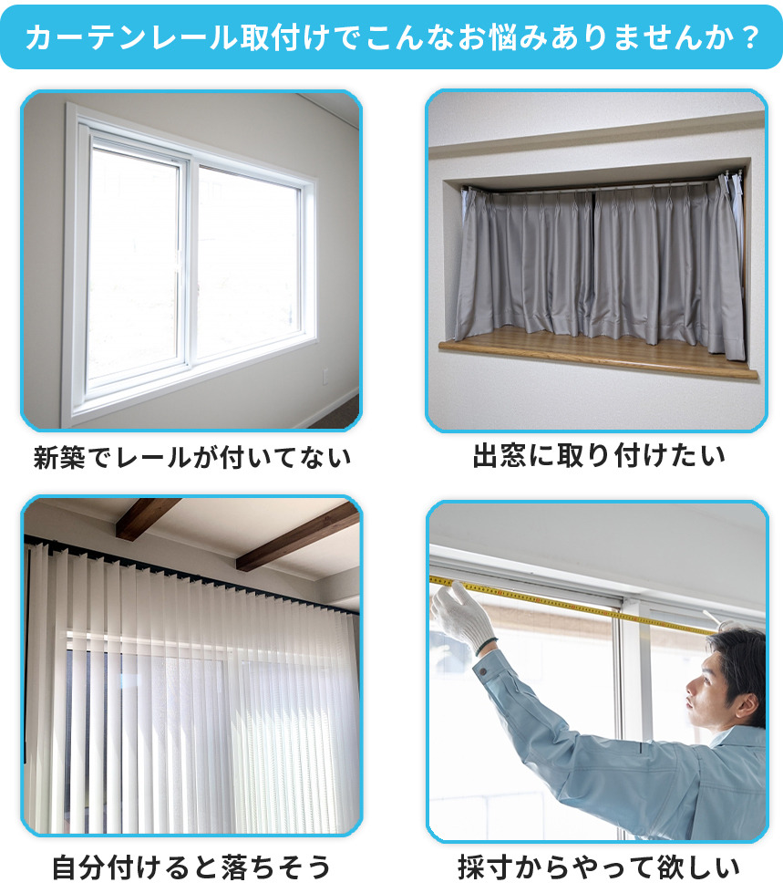メッセージ:カーテンレールの取り付けは簡単に見えるのですが、水平がずれてしまったり、壁の下地が弱くて固定できなかったりと、自分で作業すると意外と難しく、失敗の声も少なくありません。中には「取り付けた直後にレールごと落ちてきてしまった」というケースもあるほどです。