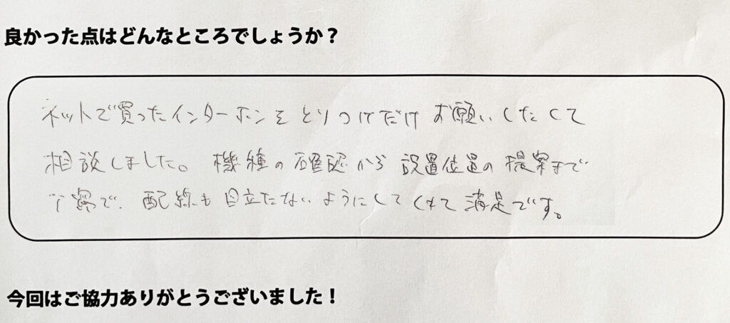 ネットで買ったインターホンを「取付けだけお願いしたい」と相談しました。機種の確認から設置位置の提案まで丁寧で、配線も目立たないようにしてくれて満足です。
